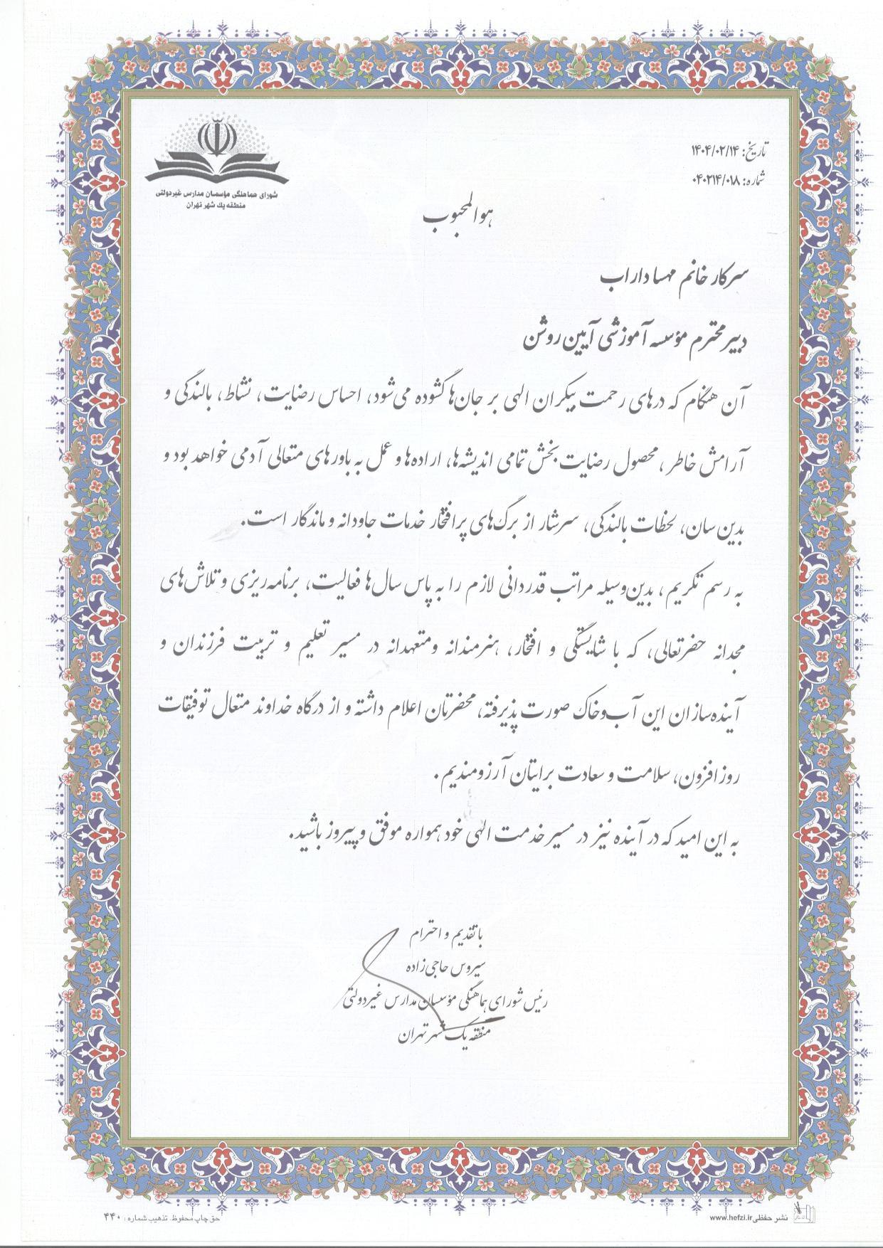 تقدیر اداره آموزش و پرورش منطقه 1 از خانم مهندس مهسا داراب به مناسبت روز معلم